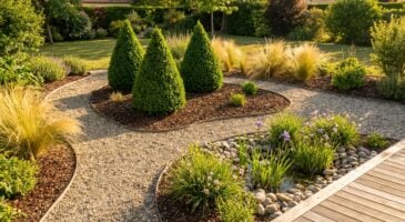 Les circulations jouent également un rôle crucial dans l’optimisation de l’entretien. Par exemple, une allée en gravier, posée sur une barrière anti-herbes, ne nécessite ni tonte ni coupe de bordure tout en mettant en valeur les massifs environnants. Dans les zones humides, un jardin de pluie avec des iris des marais ou des rudbeckies peut gérer les eaux de ruissellement efficacement. Pour les espaces plus secs, un coin minéral agrémenté de pierres et de quelques touffes choisies peut offrir une ambiance zen. Enfin, un jardin vertical installé sur un mur ou une clôture permet de libérer le sol tout en ajoutant une touche de verdure.