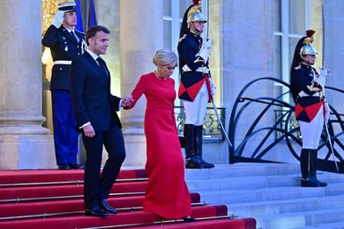 - Brigitte Macron dans une robe de bal rouge, ornée de bijoux Louis Vuitton.