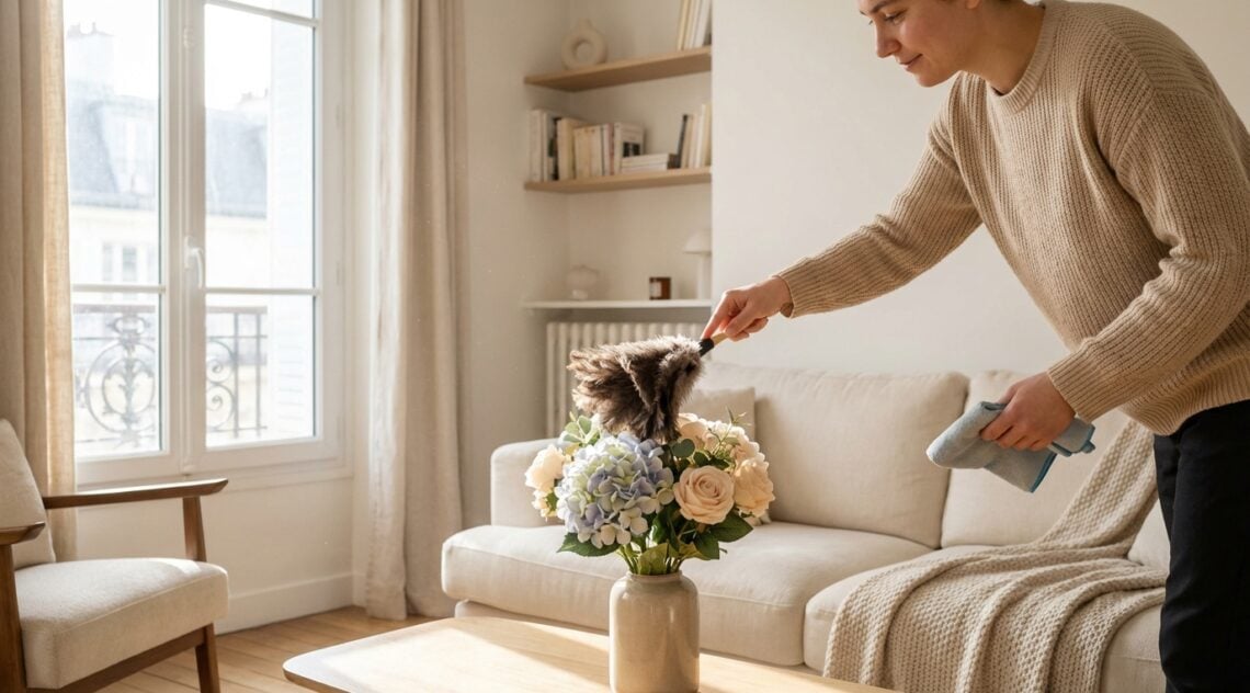 Il est recommandé de garder un mini-kit d’entretien pour vos fleurs artificielles, comprenant un plumeau fin et un chiffon microfibre, à portée de main dans le meuble TV ou le buffet, pour un accès rapide après avoir passé l’aspirateur. C’est un moyen simple d’intégrer ce soin dans votre quotidien.