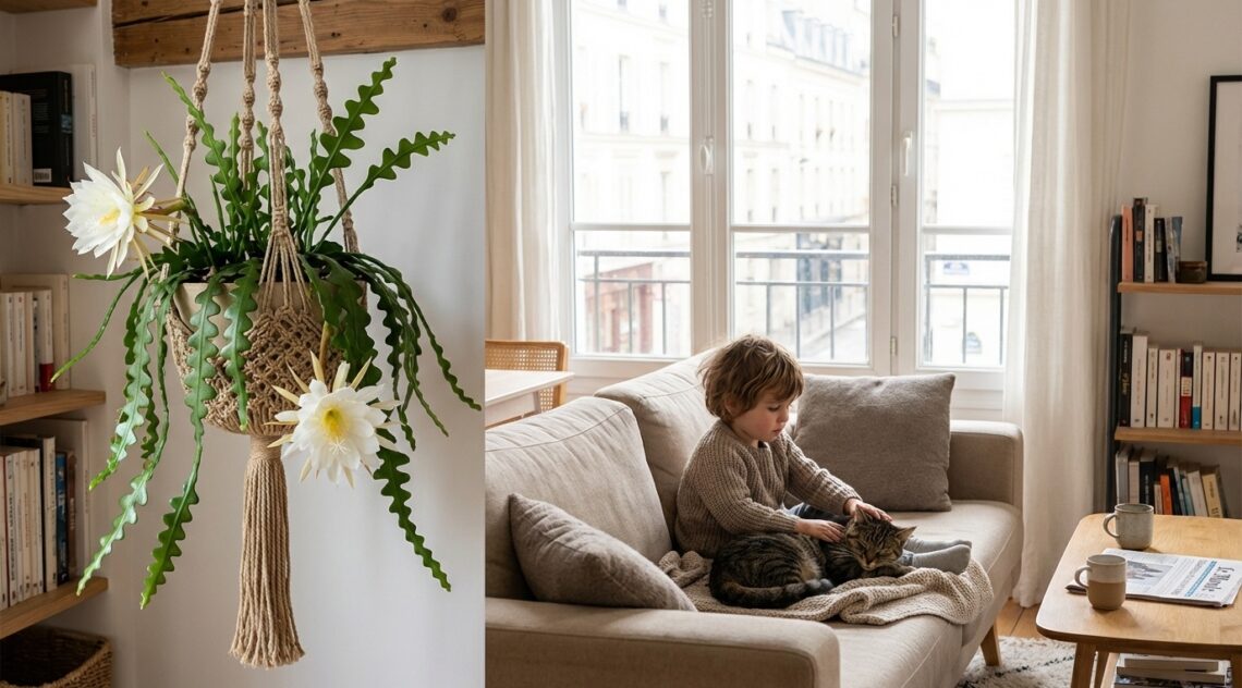 Dans un salon ensoleillé, un cactus se distingue par sa silhouette élégante et ses grandes fleurs blanches. Ce cactus, connu sous le nom de Disocactus anguliger, ou cactus zigzag, a su séduire de nombreuses familles et amateurs de décoration intérieure. Sans épines, il se révèle être idéal pour les foyers avec enfants et animaux de compagnie.