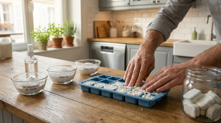 Cette méthode est adaptée aux lames en aluminium ou en PVC, tant que la chaussette reste légèrement humide. Pour des traces de calcaire, notamment près d’un évier, un mélange de vinaigre et d’eau peut être utilisé localement, toujours en veillant à ne pas saturer la surface.