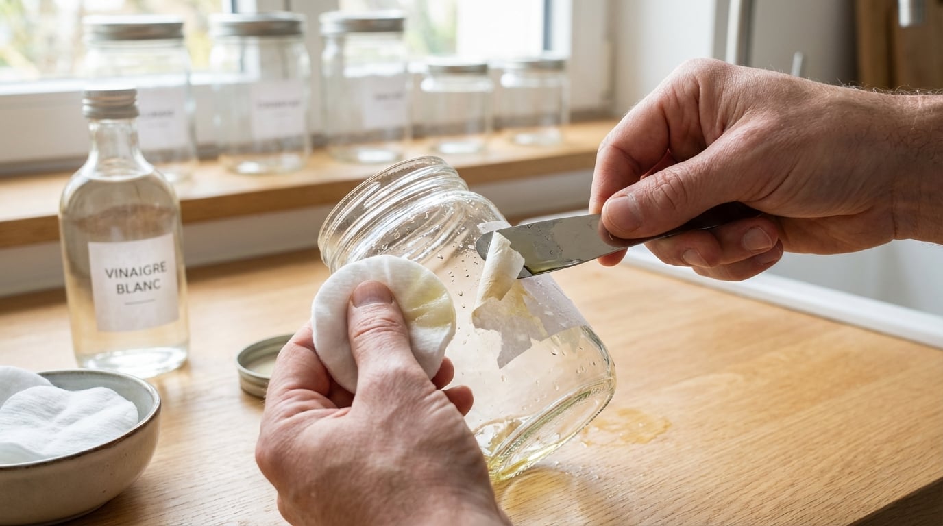 Après avoir retiré l’étiquette, il est courant de constater un film gras ou quelques traces blanchâtres sur le verre. Pour cela, le vinaigre blanc est un excellent allié. En versant un peu de vinaigre sur un chiffon, et en frottant la zone concernée, le voile disparaît instantanément. Pour terminer, un rinçage à l’eau chaude avec un peu de liquide vaisselle est recommandé. Cela permet de retrouver un verre étincelant, prêt à être réutilisé pour stocker pâtes, riz ou confitures.