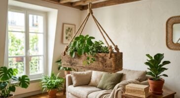 Accrocher vos plantes au plafond ou au mur peut instantanément transformer l’esthétique de votre intérieur. Cela attire le regard vers le haut, aérant les volumes et mettant en valeur chaque pothos ou fougère qui retombe gracieusement. L’utilisation de bois de récupération offre une chaleur visuelle, bien plus agréable qu’une étagère métallique standard.