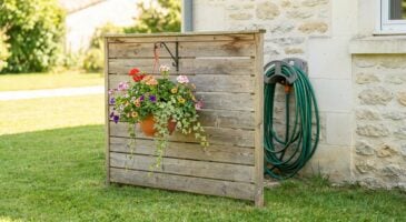 Pour installer votre cache tuyau d’arrosage, positionnez-le à quelques centimètres du robinet extérieur, tout en veillant à ce qu’il ne gêne pas le passage. Le support de tuyau se fixe à l’arrière du cadre, à une hauteur confortable pour un enroulement aisé. Sur la face avant, une potence pourra accueillir un pot suspendu rempli de fleurs ou de plantes retombantes, détournant ainsi l’attention de l’arrière.