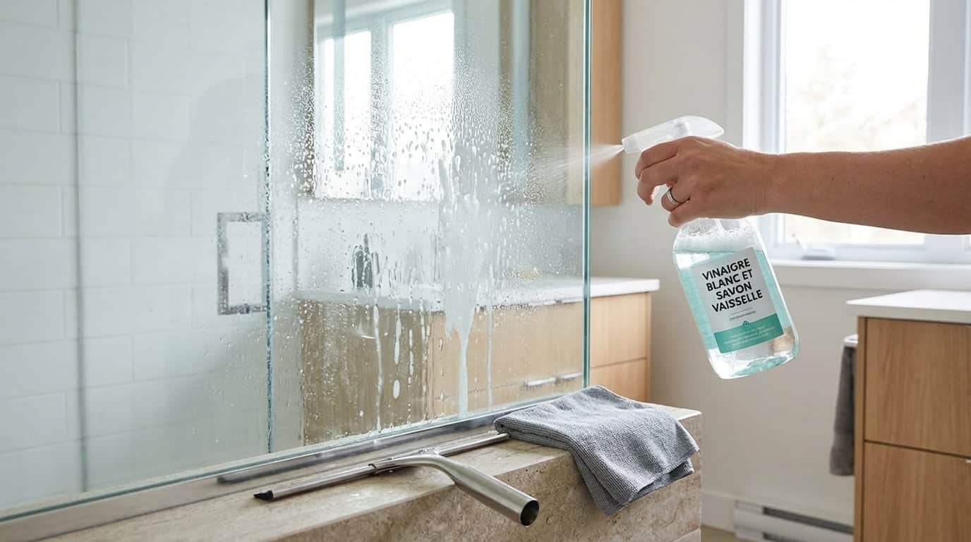 Le vinaigre blanc, grâce à sa composition riche en acide acétique, se révèle être un véritable détartrant. Lorsqu’il est utilisé tiède, il agit plus rapidement, un peu comme l’eau chaude sur la graisse des plats. L’ajout de liquide vaisselle apporte des tensioactifs, qui aident à déloger les résidus gras laissés par les gels douche, tout en facilitant l’application du mélange sur le verre. Ensemble, ces deux ingrédients forment un nettoyant maison efficace pour dissoudre en profondeur le tartre et le savon.