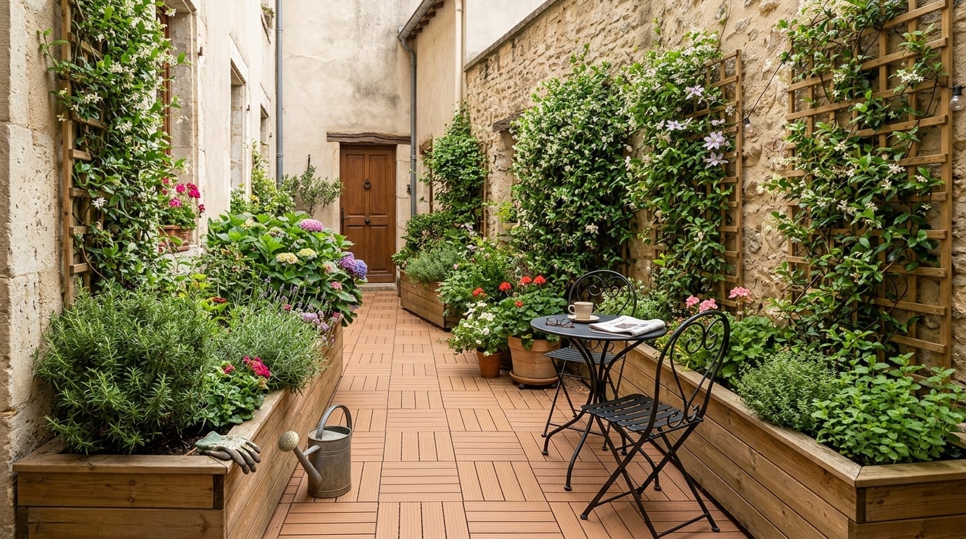Il a imaginé une méthode en plusieurs couches, comme un millefeuille. Au sol, il a opté pour un revêtement léger et drainant, puis a ajouté de grands bacs de culture qui remplacent la terre absente. Les murs ont également été habillés de verdure, créant ainsi un espace agréable et vivant. Ce concept est particulièrement adapté aux petits jardins urbains, où chaque centimètre compte et où la réversibilité des aménagements est un atout pour les locataires et copropriétaires.